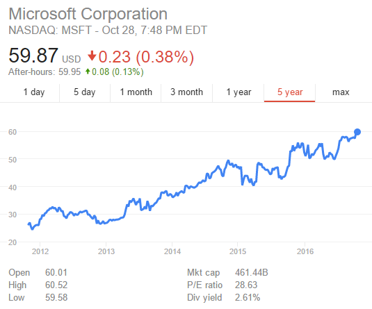 - Similar to Apple, Microsoft also strives for innovation, which is probably what attracted me most toward investing. Their CEO, Bill Gates, claims that innovation is what keeps our world moving forward. Recently, Microsoft has shaved their old image and created a more fresh one, which is something that draws my attention, because this shows how devoted they are to change. Microsoft is part of the technology industry, which is no longer a want, rather, it’s becoming a need in today’s society; since Microsoft is in charge of over 90% of the software run on computers today, I think it’s a good idea to invest in them. As you can see from the graph below, Microsoft is at an all-time high in the past five years. To me, it looks like it will continue to rise. The company has a P/E ratio of 28.63, and a dividend yield of 2.61%. This investment will be a mainly long term investment for me since I think the products and software Microsoft will be releasing will take a huge effect on their stock prices.